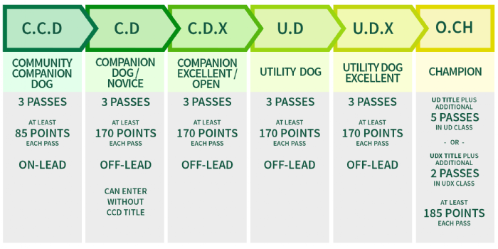 - Heelwork, where a judge will verbally instruct the handler to turn left, right, about-face, halt, stand, and down their dog.
